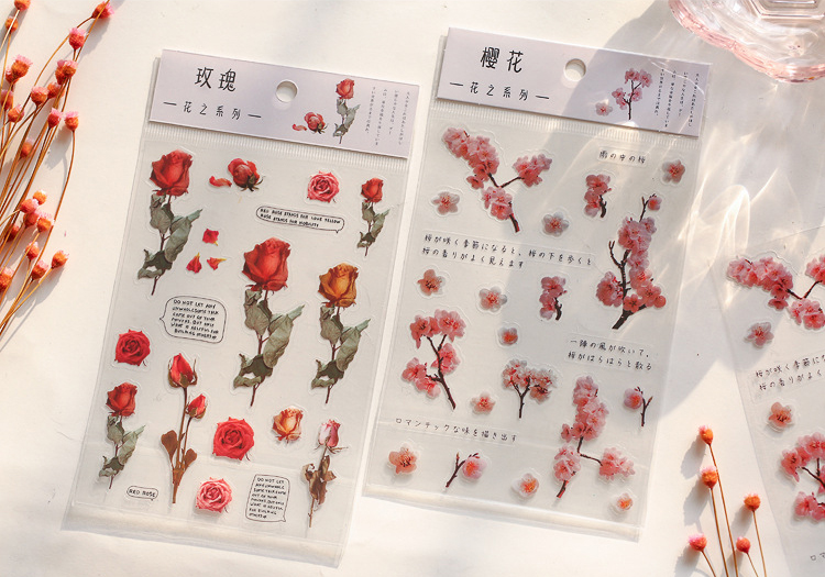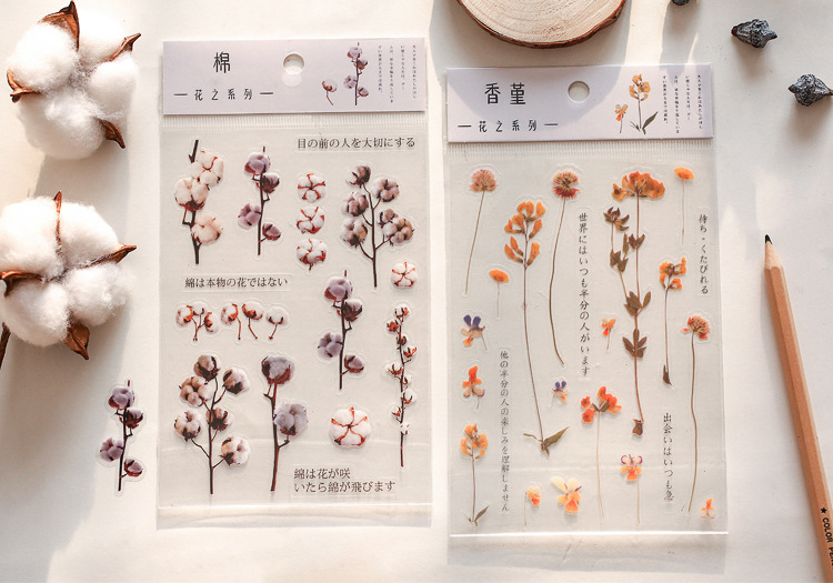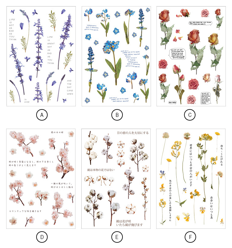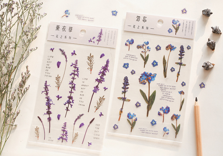 Transparente Blumen und Pflanzen Sticker - Lavendel, Vergissmeinnicht, Rose, Kirschblüte, Baumwolle und Stiefmütterchen